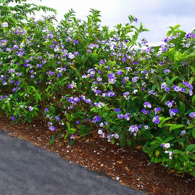 Brunfelsia pauciflora (Yesterday-Today-and-Tomorrow) is a bushy, free-flowering shrub, masses of fragrant flowers that change color over three days: opening deep purple (yesterday), fading to lavender (today), and turning white (tomorrow), bloom profusely in spring and summer, displaying all three colors simultaneously, full sun to partial shade, acidic, compost-rich, moist soil, grows 2 m tall, can be used as a screen or hedge, in beds and borders, as a specimen plant or in container planting, attract bees, butterflies, and other beneficial insects, creating a lively ecosystem